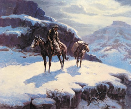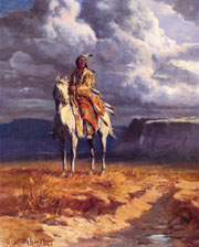Print Size: 22 3/4" x 19" Included Free with "Lonesone Trail" This image was scheduled for release as a limited edition print in May 1988 and was withdrawn from the market after Olaf Wieghorst's death because it was unsigned. This special print is numbered to match "Lonesome Trail." The print is sometimes called the "Lonesome Trail Warrior" |