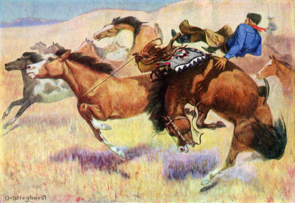 Aherd of wild running horses fill the canvas. A cowboy on a Bay horse is in big trouble. He has just roped a wild Buckskin horse while another Buckskin is running into his rope breaking the chinch on his saddle. His saddles flies off and he is in the air. A cowboy in the background looks on but is unable to lend assistance. The action is set on a dry grass covered prairie in front of a nearby mountain. This is a similar motif to the artist's painting "Interference." The image appeared in "The Star Weekly", January 4, 1947. Caption below picture: "During the last roundup he had been jerked from his saddle and nearly trampled to death."