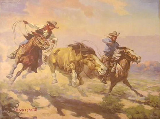 This early action calendar print features two cowboy roping a wild buckskin horse. A “Fine Arts” and a "Perfect Picture" puzzle was also made using this image.