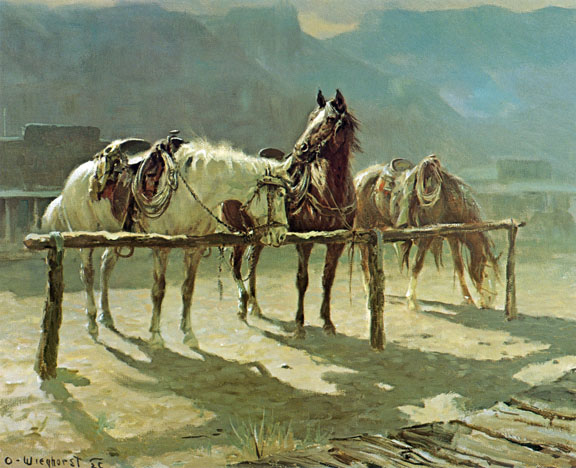 Three saddled horses, tied to a hitching rail, fill the canvas.