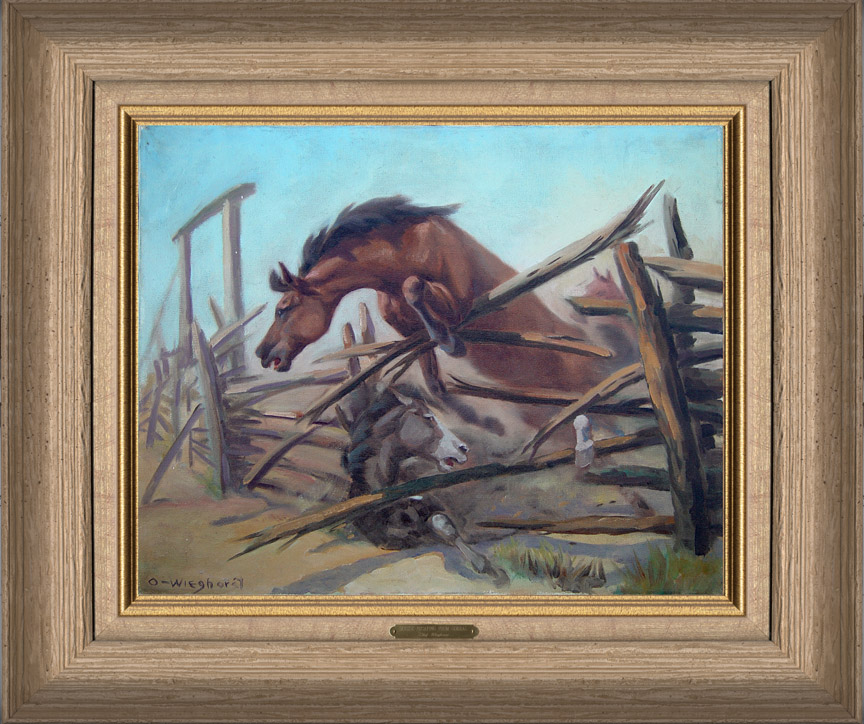The horse in the foreground has fallen and in danger of being