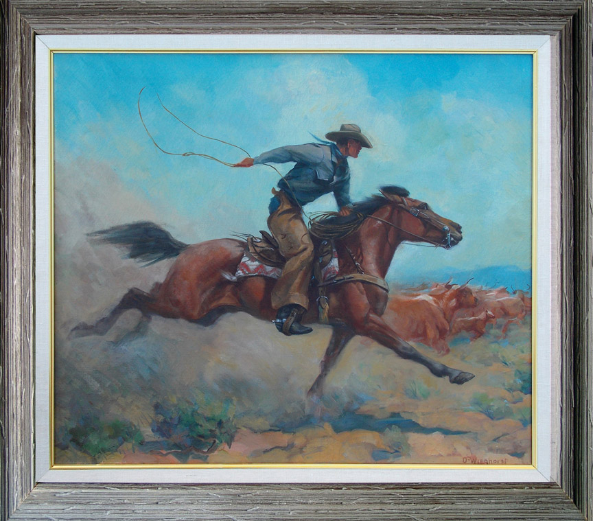 his lariat as his horse kicks up a cloud of dust. In the middle