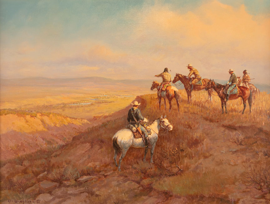 Indian scouts and a cavalryman join Custer at a ridge overlooking